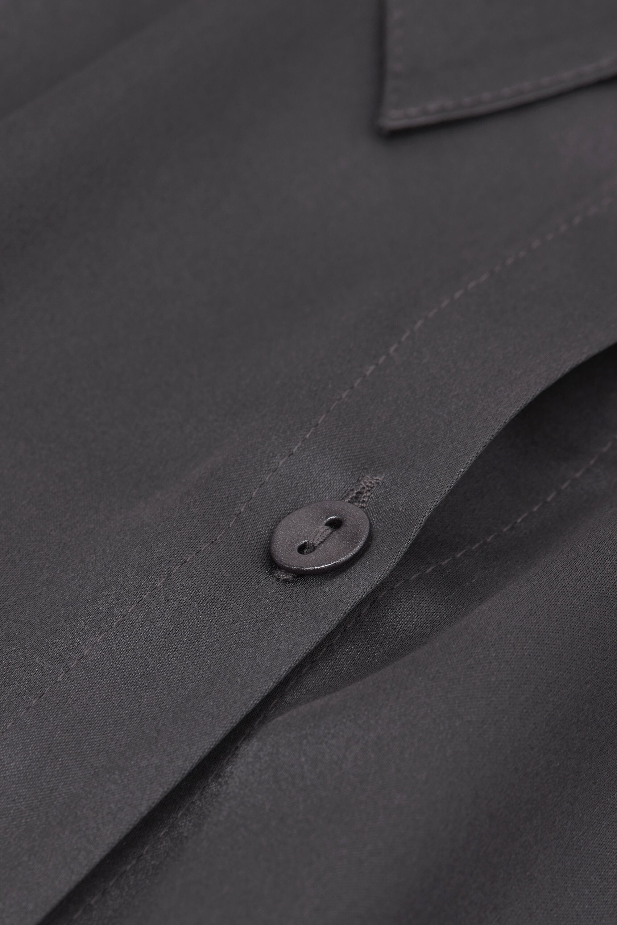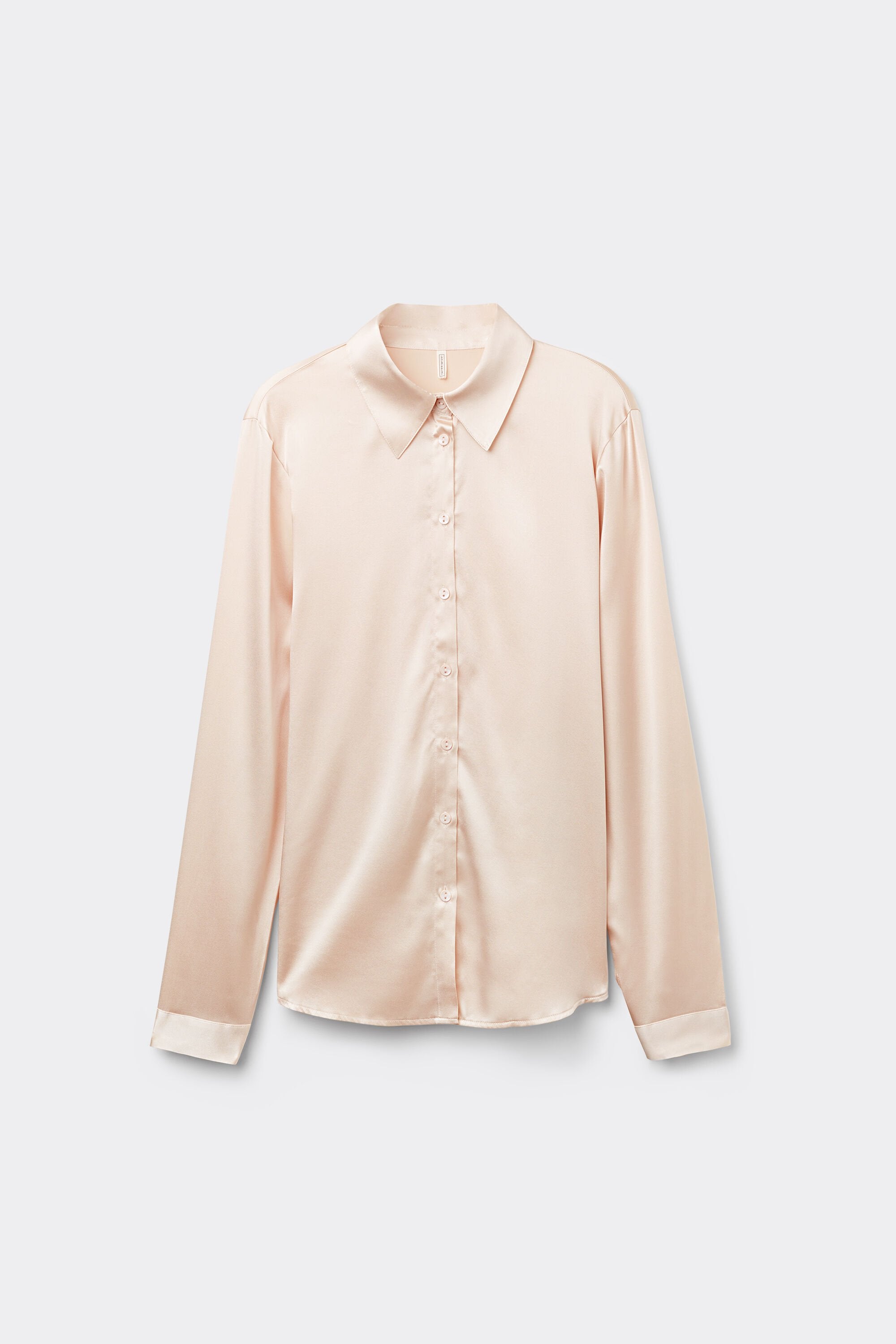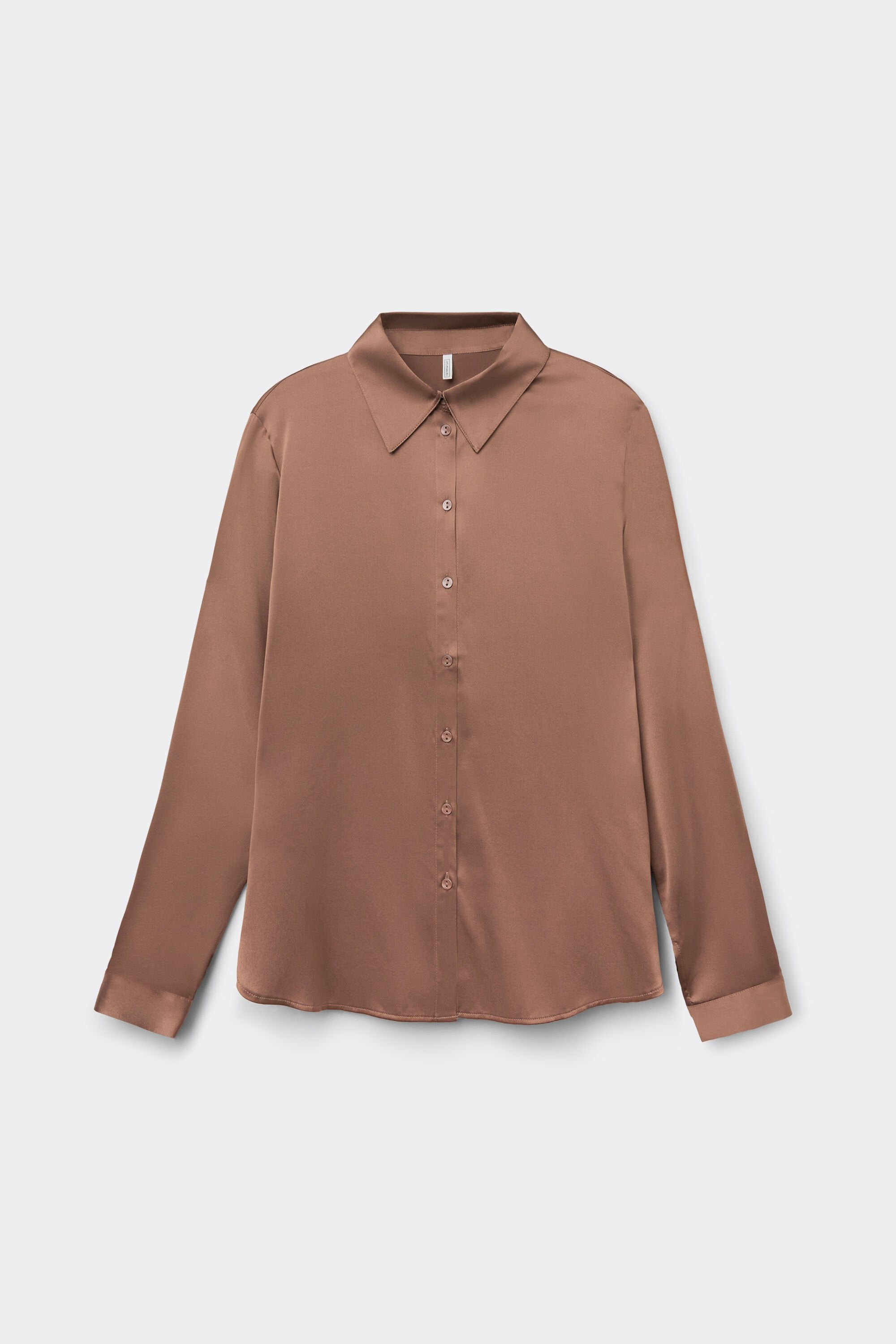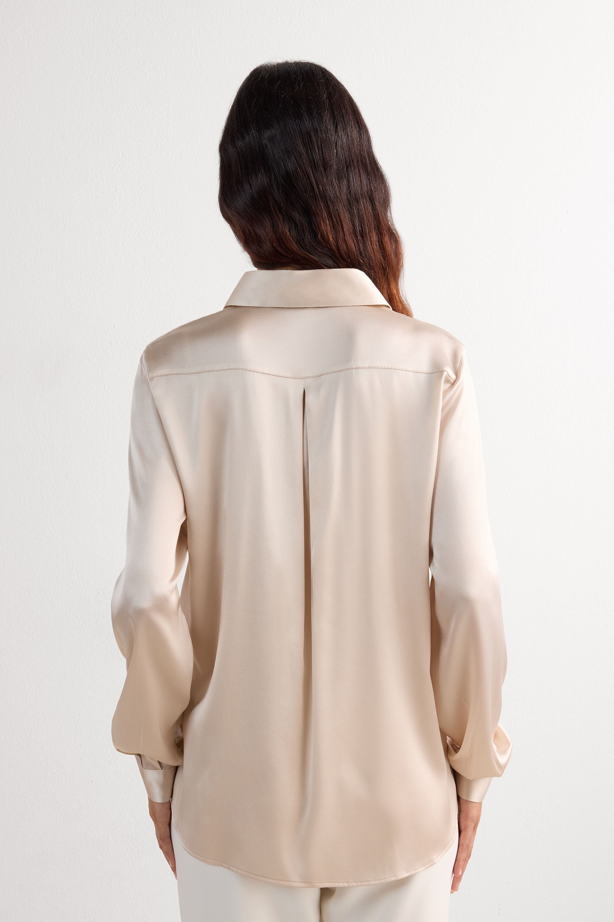 Crafted from lightweight stretch silk with a gentle drape and subtle sheen, this shirt features a classic collared neckline, a neat buttoned front, and a soft back pleat. The rounded hem and long sleeves with buttoned cuffs create a timeless, softly tailored silhouette that is both breathable and comfortable.