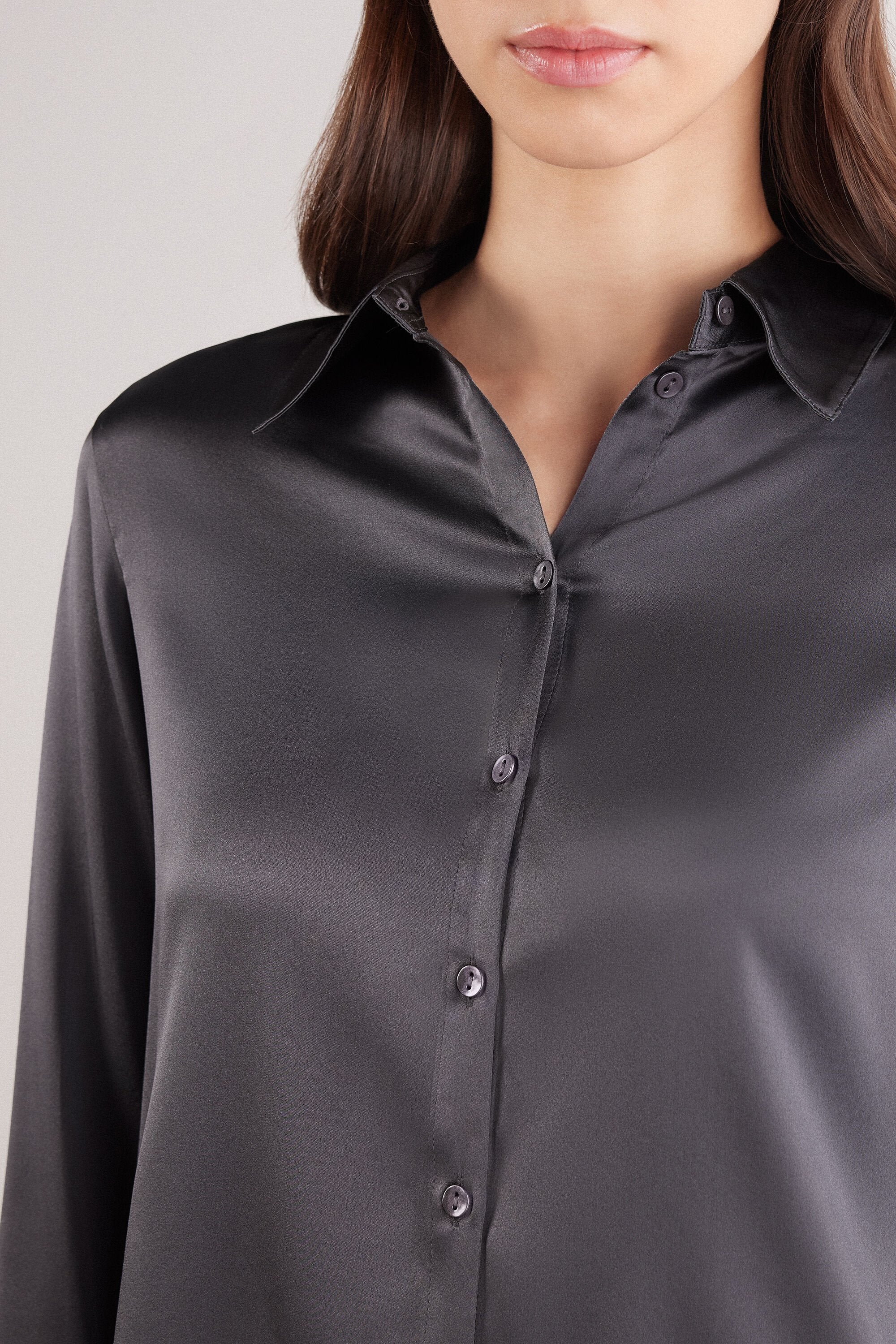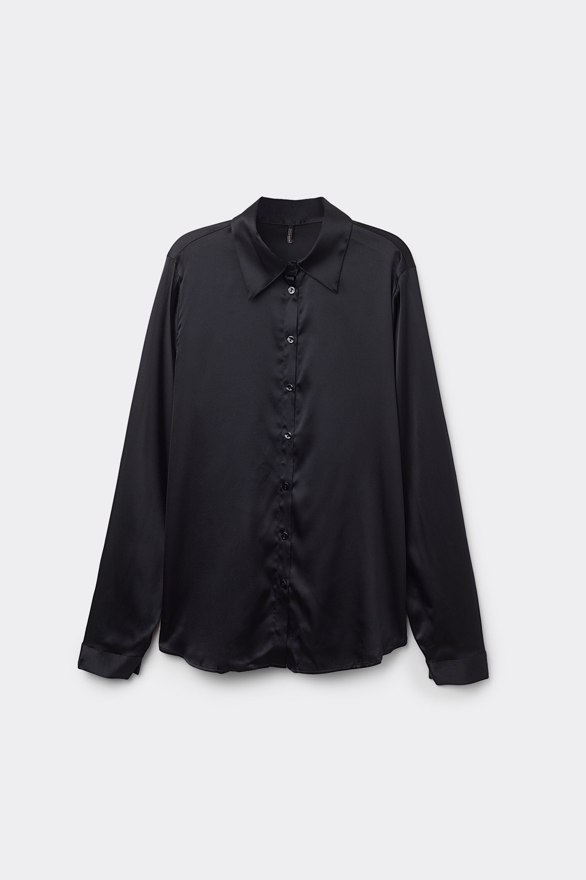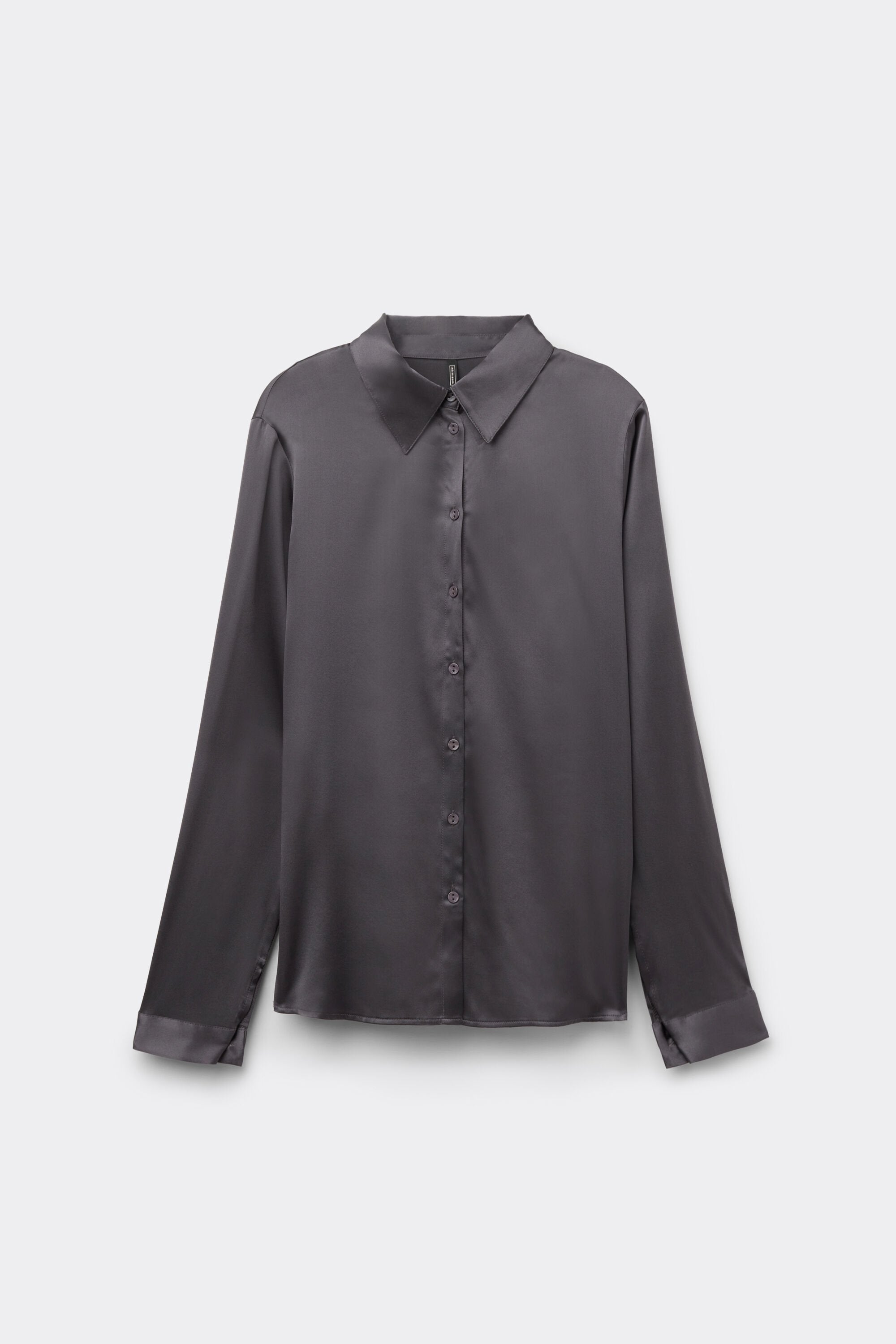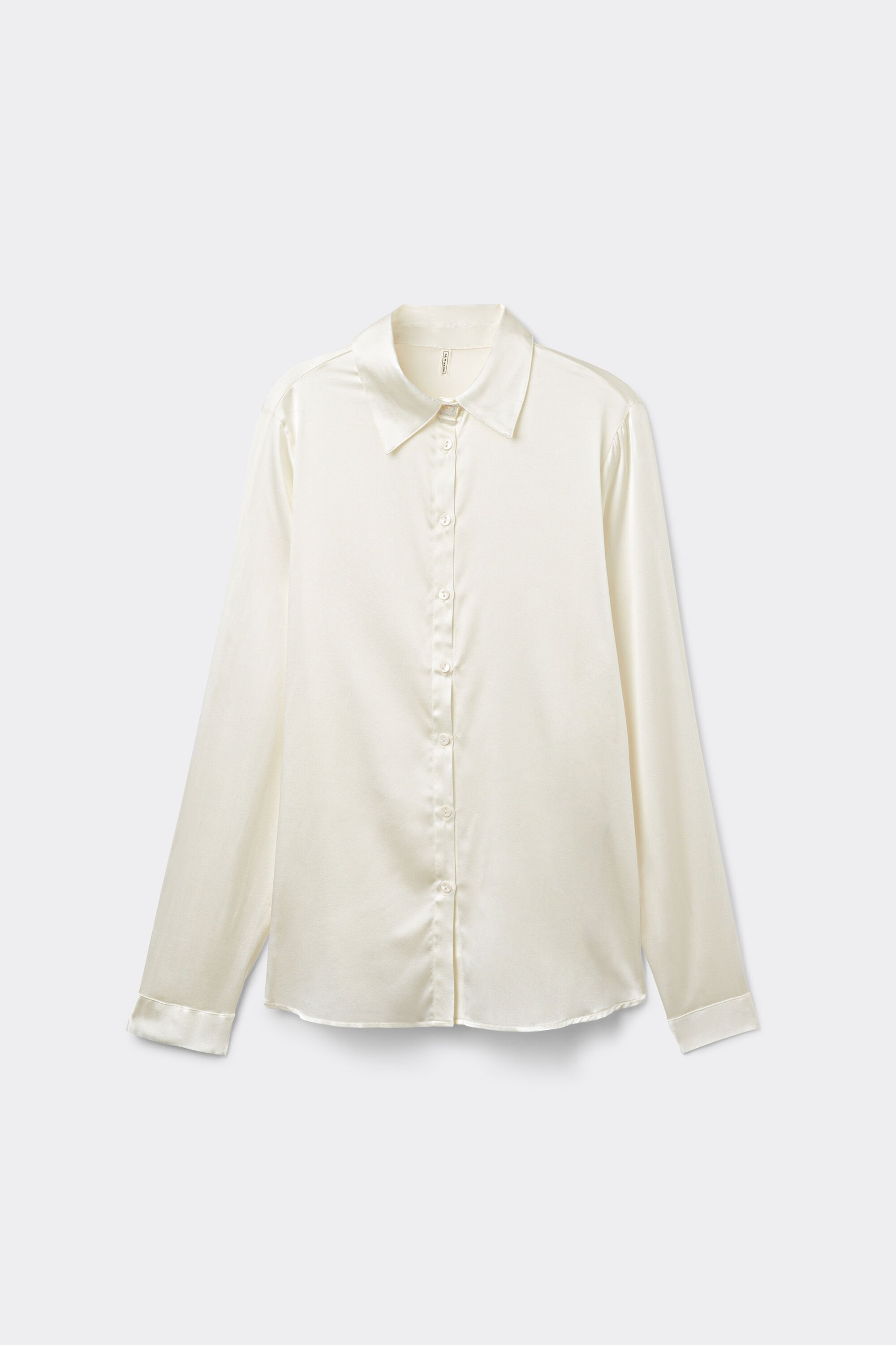 Crafted from lightweight stretch silk with a gentle drape and subtle sheen, this shirt features a classic collared neckline, a neat buttoned front, and a soft back pleat. The rounded hem and long sleeves with buttoned cuffs create a timeless, softly tailored silhouette that is both breathable and comfortable.