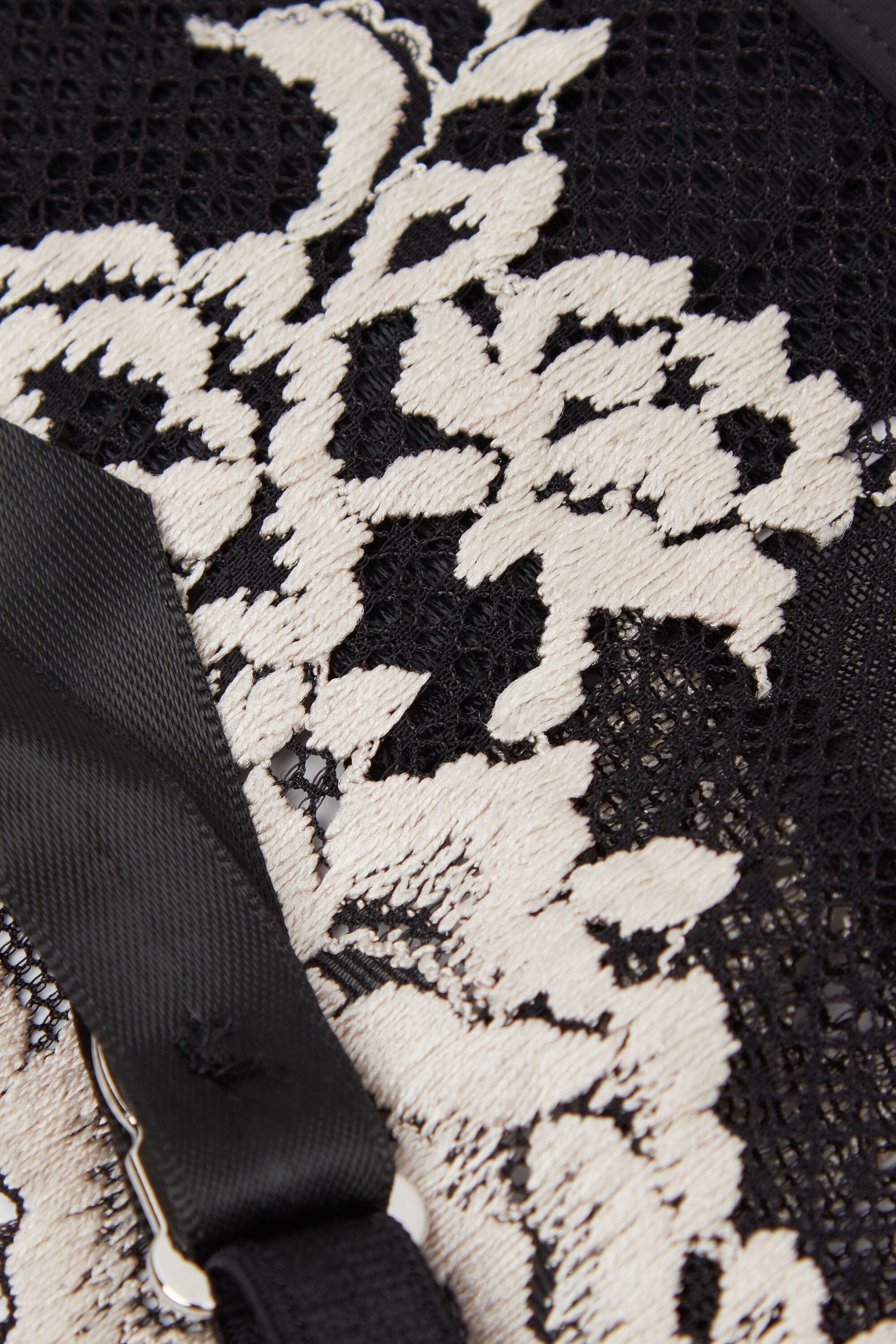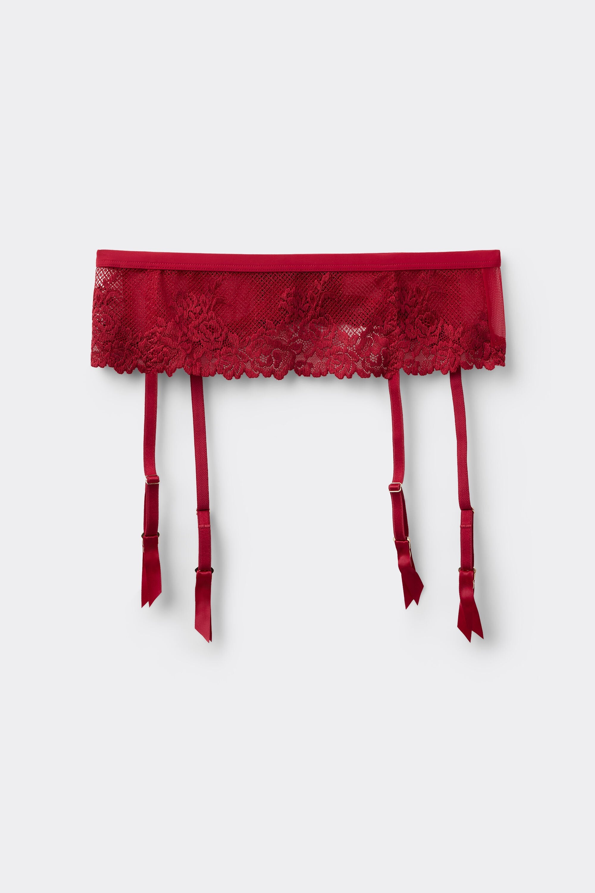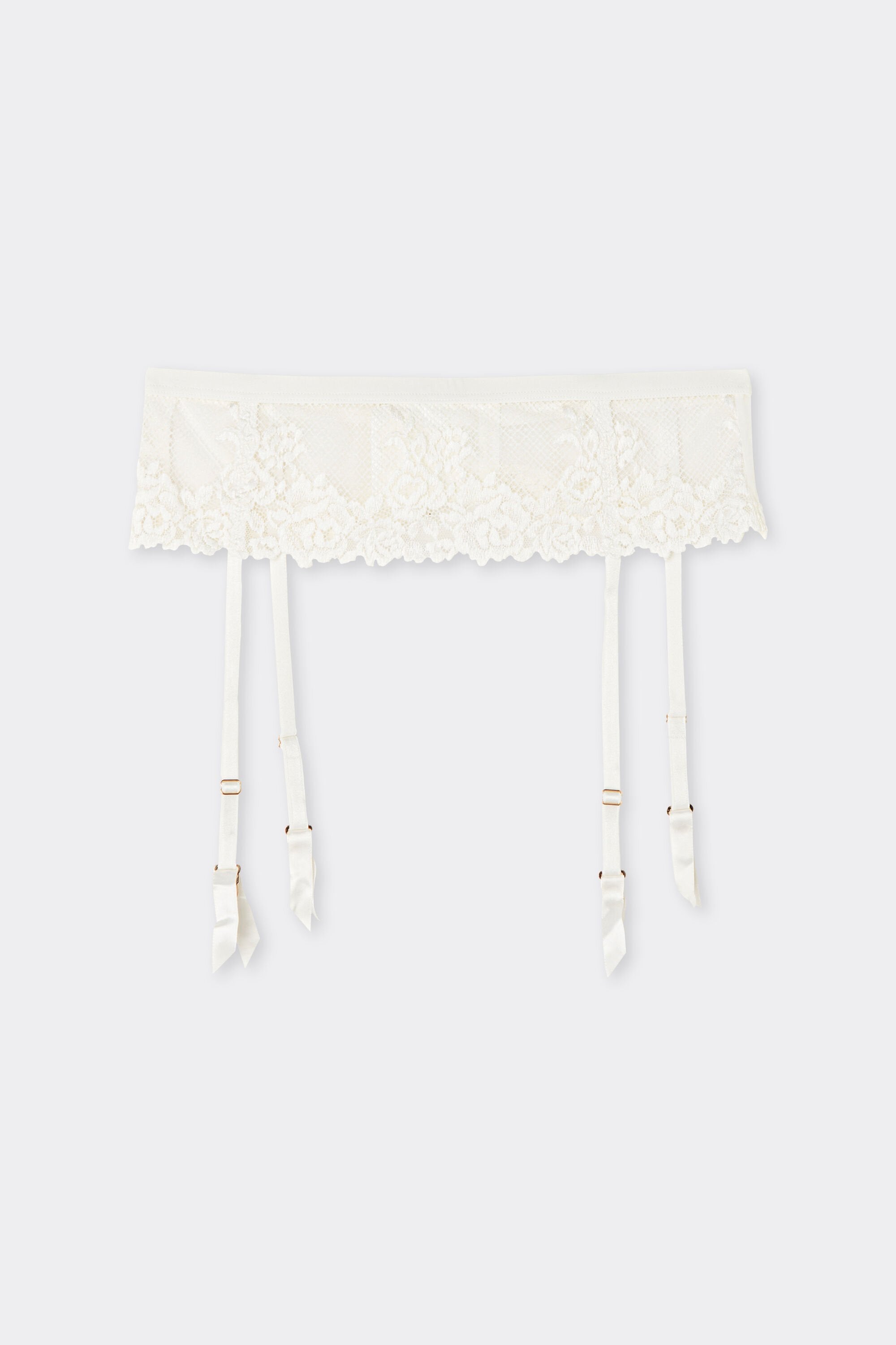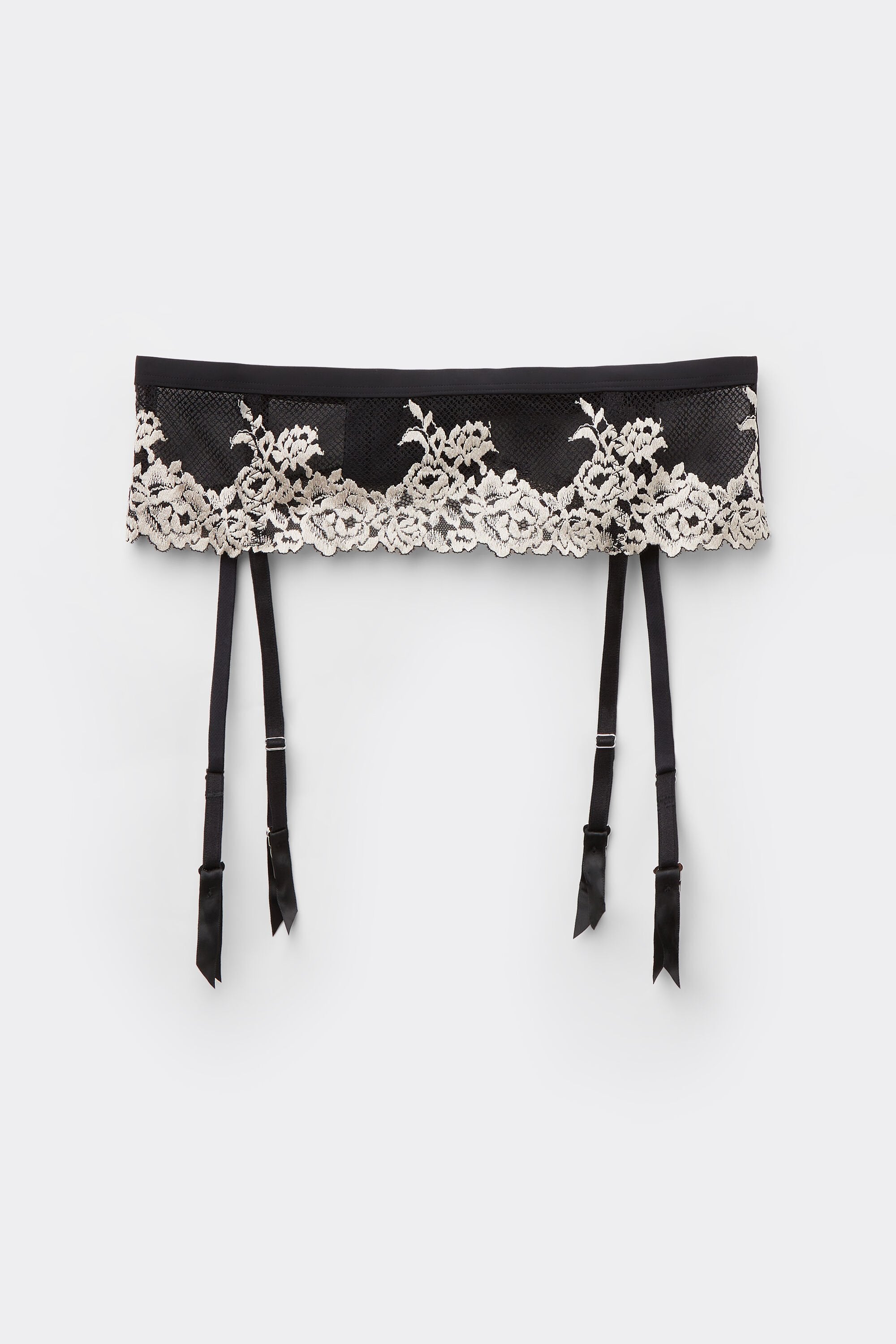 This garter belt forms a delicate and structured base layer, crafted from a mix of floral lace, tulle, and stretch fabrics that blend transparency and flexibility with a soft touch against the skin. Its high-rise cut gently shapes the silhouette while creating a smooth, feminine outline, with a wide waistband and slim suspenders that pair beautifully with thigh-high stockings.
