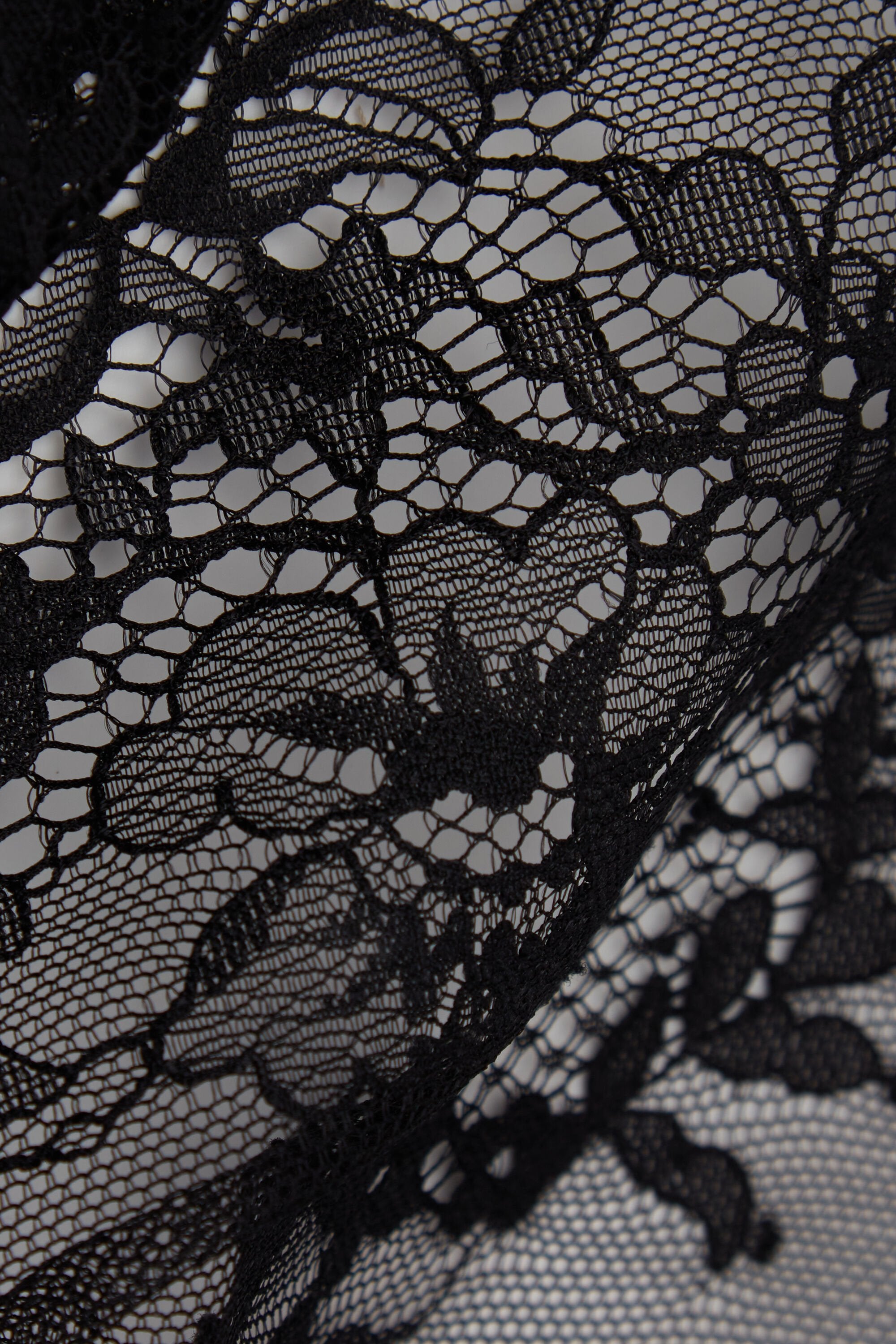 This lace robe features a delicate ruffle trim and a soft satin belt for a flattering silhouette.
