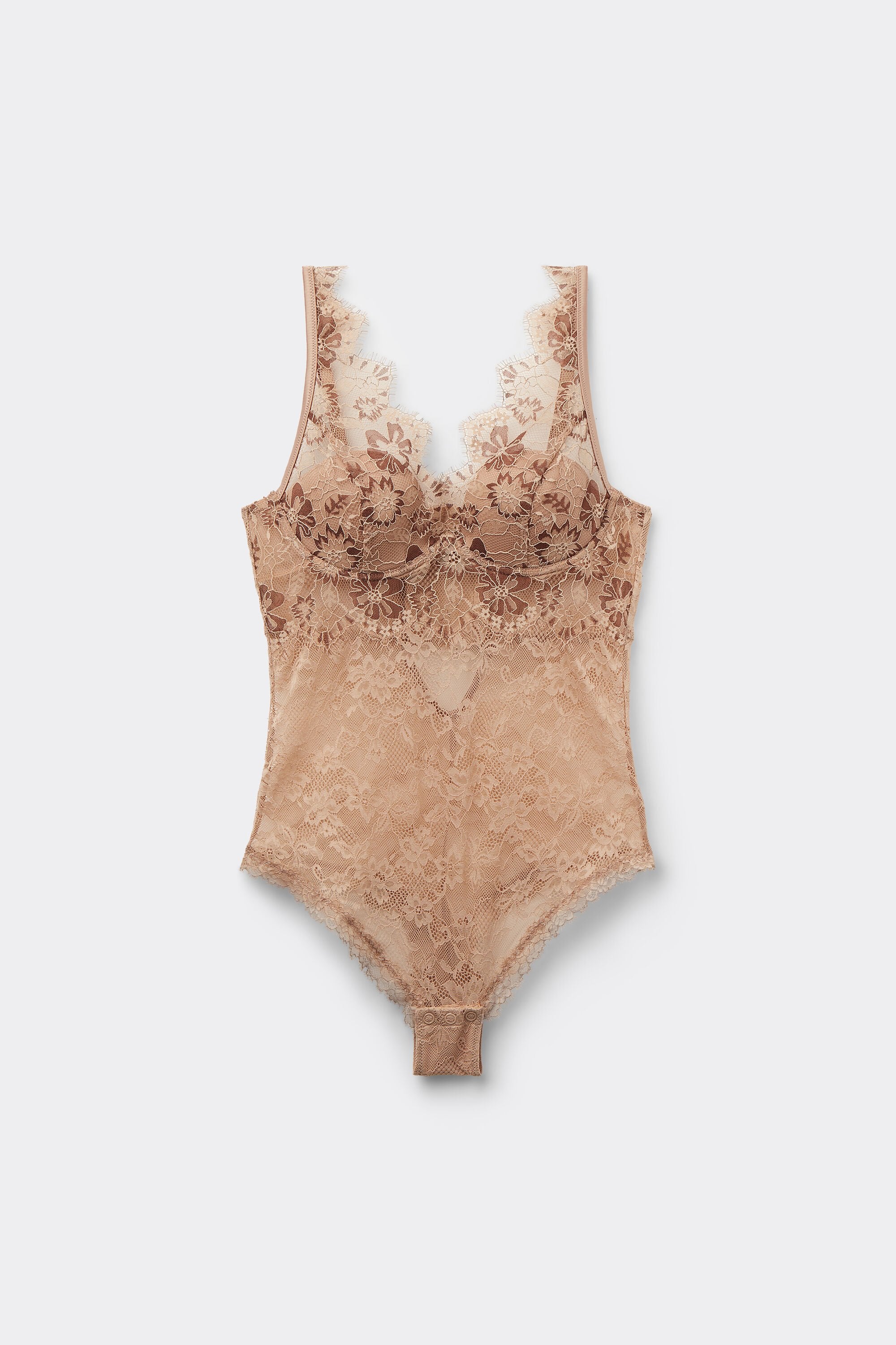 The bodysuit features delicate two-tone lace in natural nude shades, combined with elegant satin details and a romantic ruffle trim for a beautifully refined silhouette.