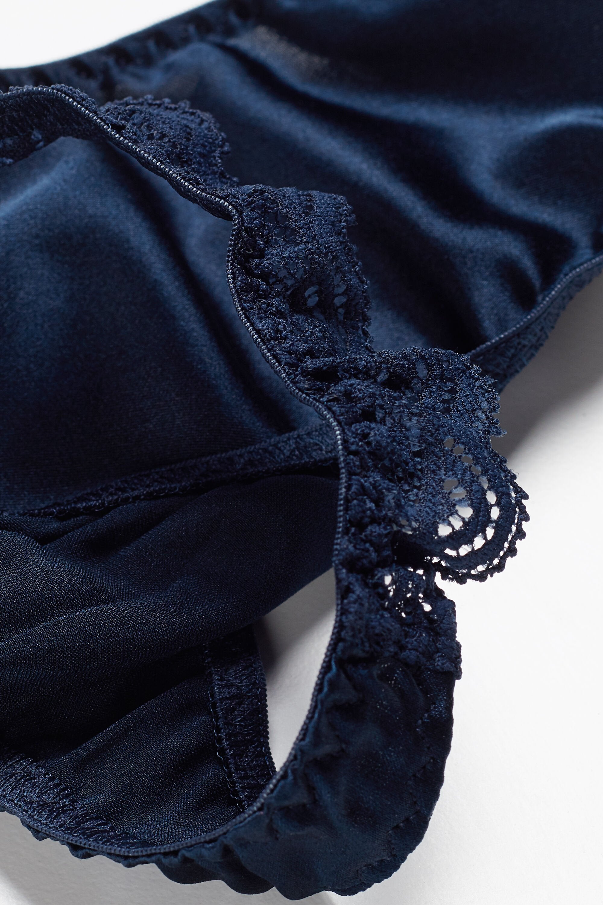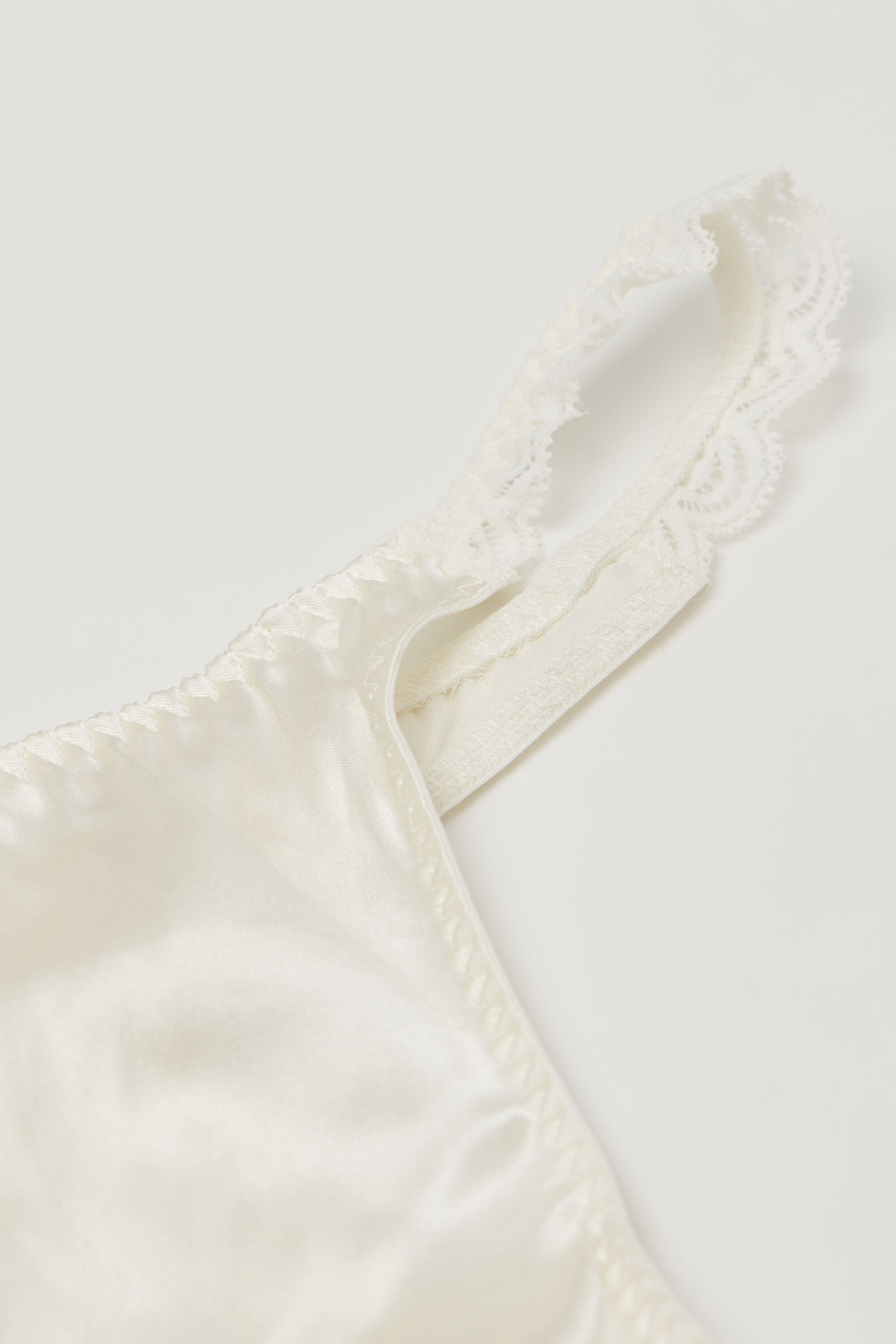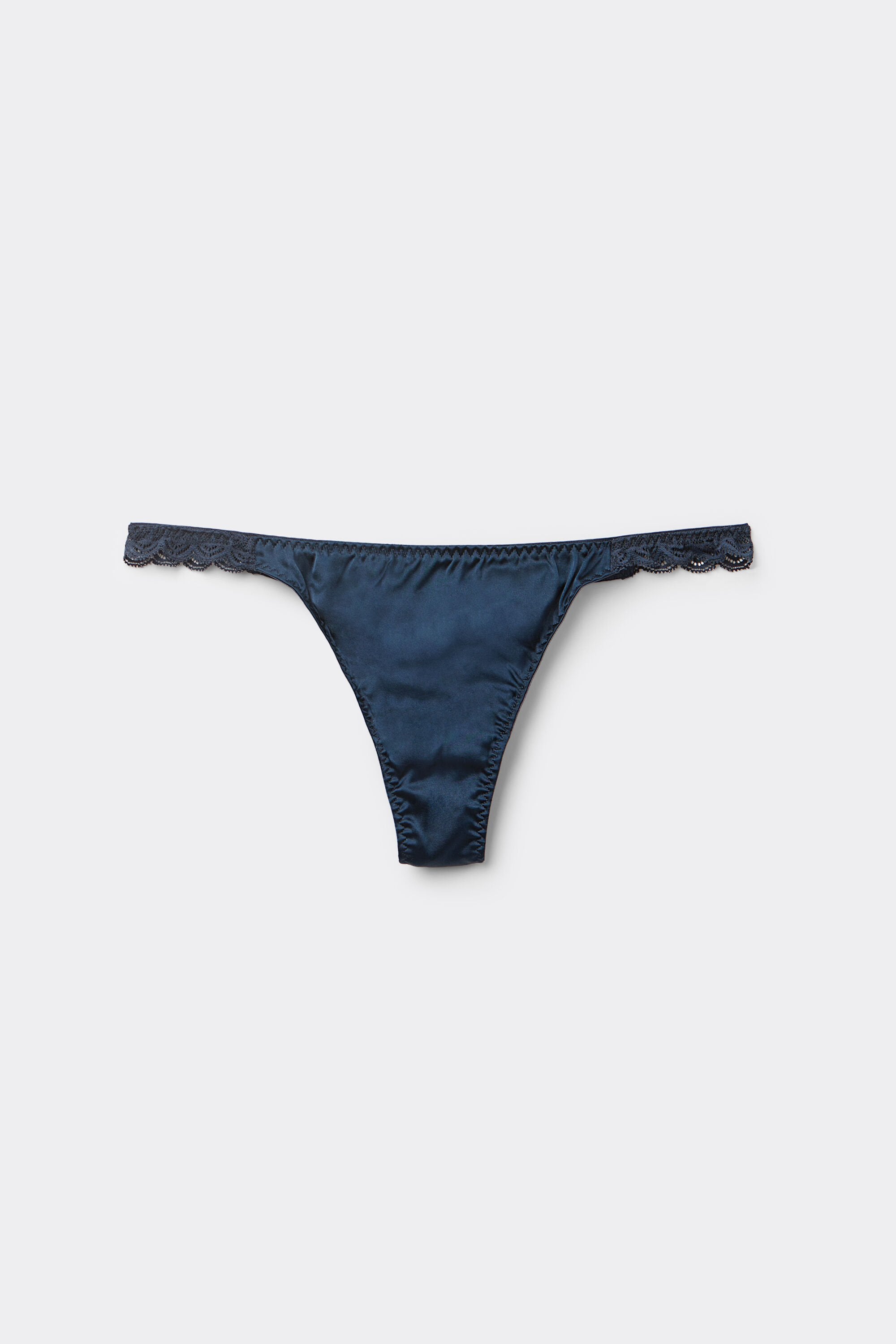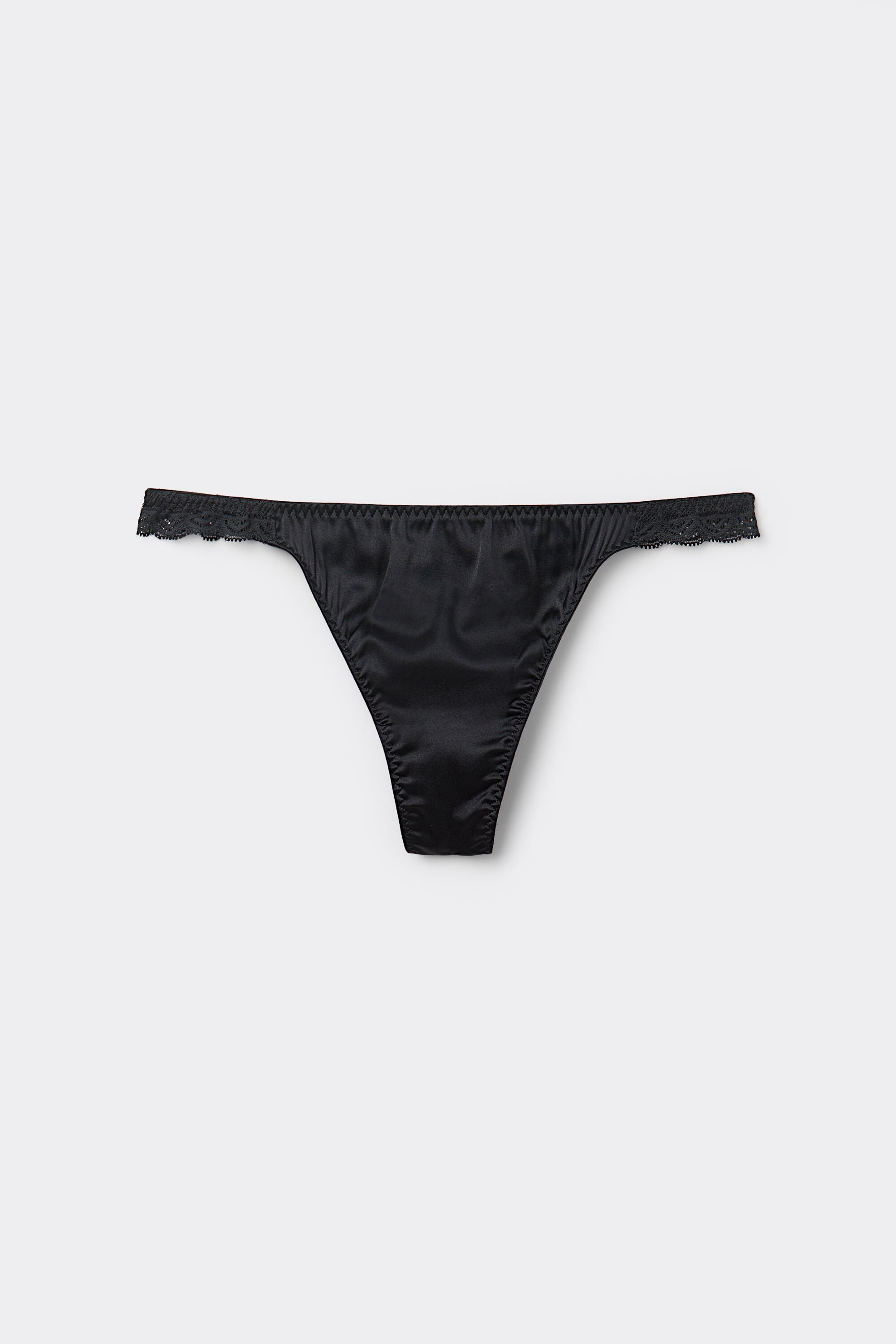 This delicate piece features a silk G-string with side panels adorned by intricate lace inserts, offering a subtle and sensual detail. The pure cotton inner gusset ensures comfort and breathability throughout wear.