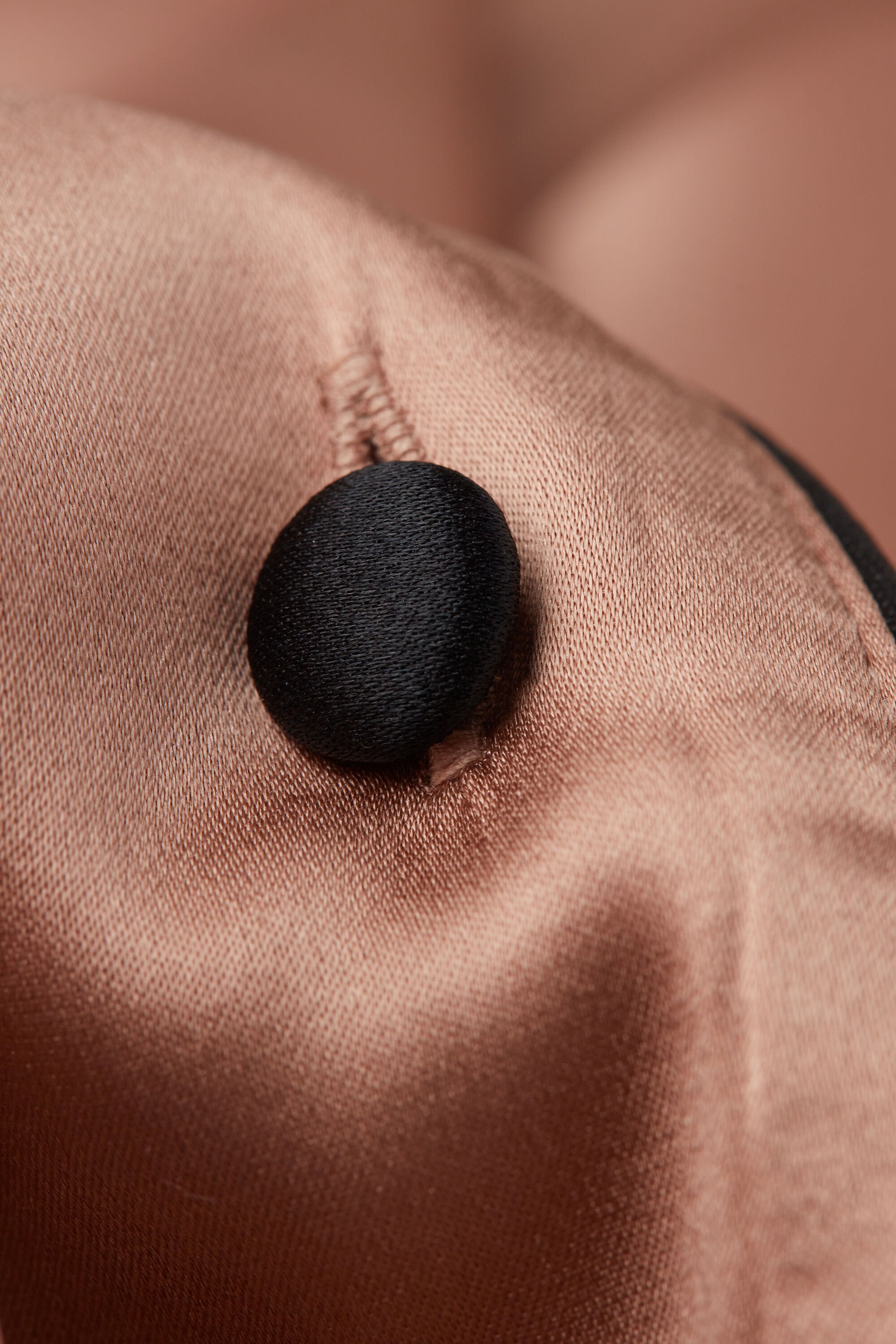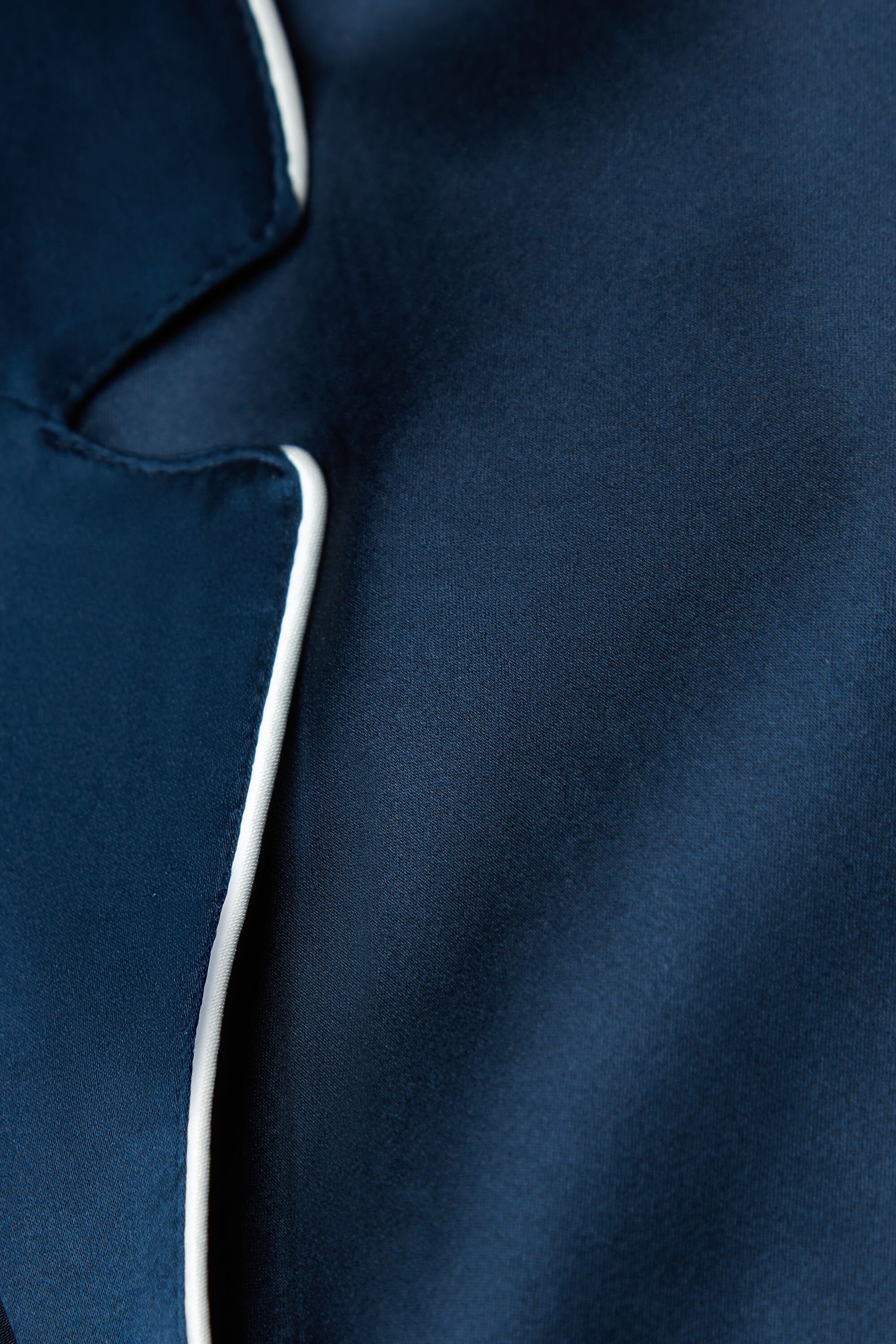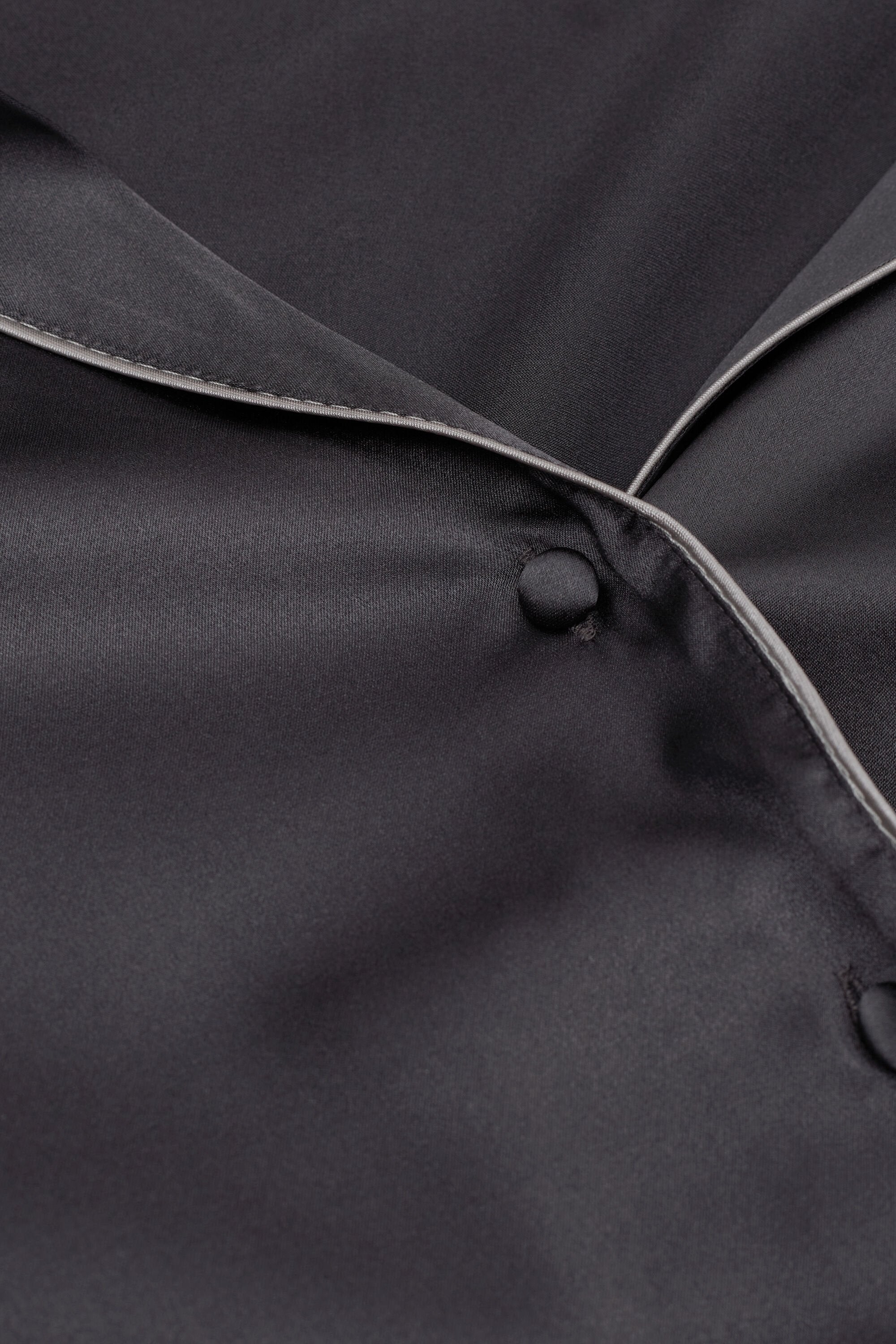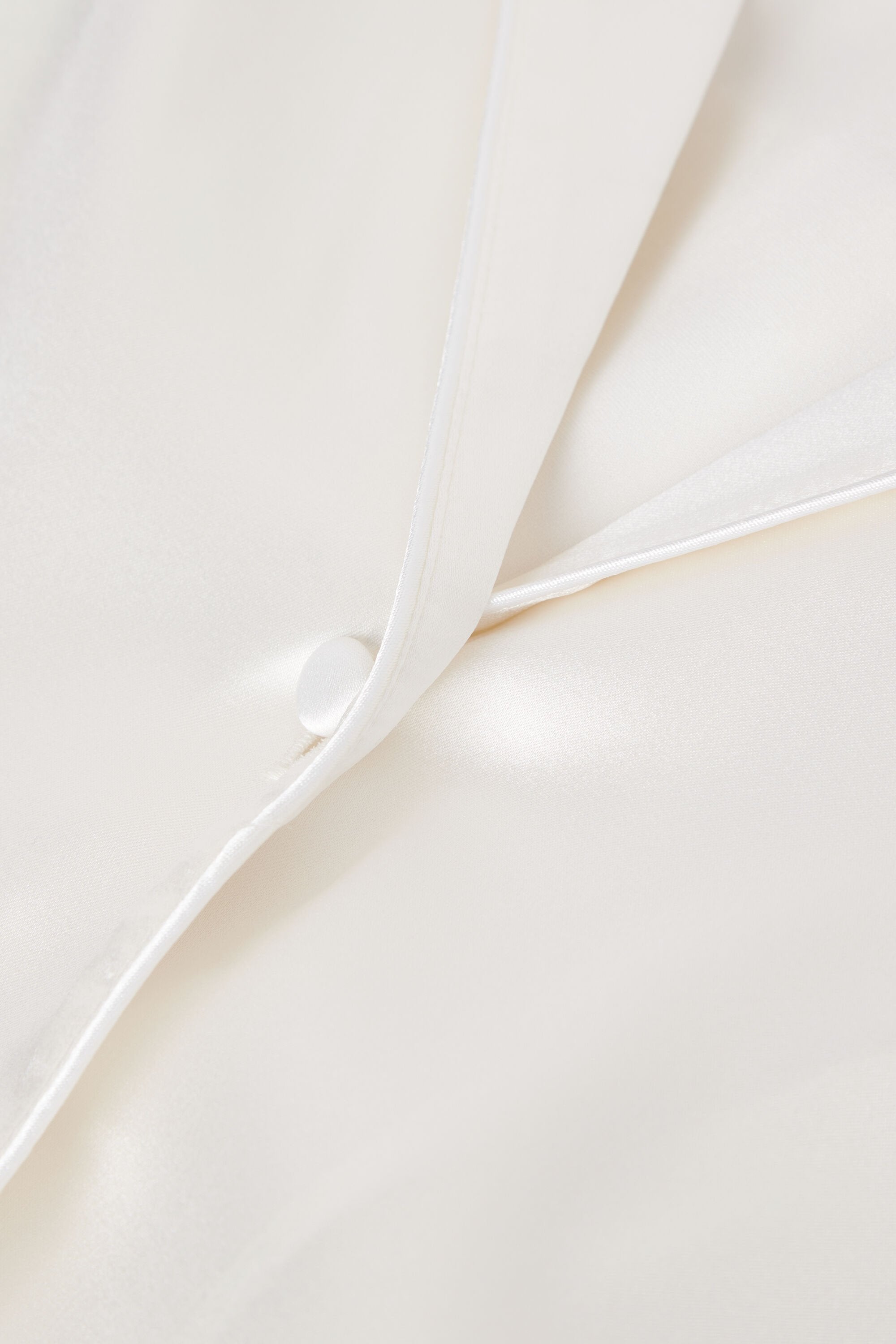 The jacket features a classic menswear-inspired cut in a light stretch silk satin, finished with elegant trim details that create a subtle, tailored statement.