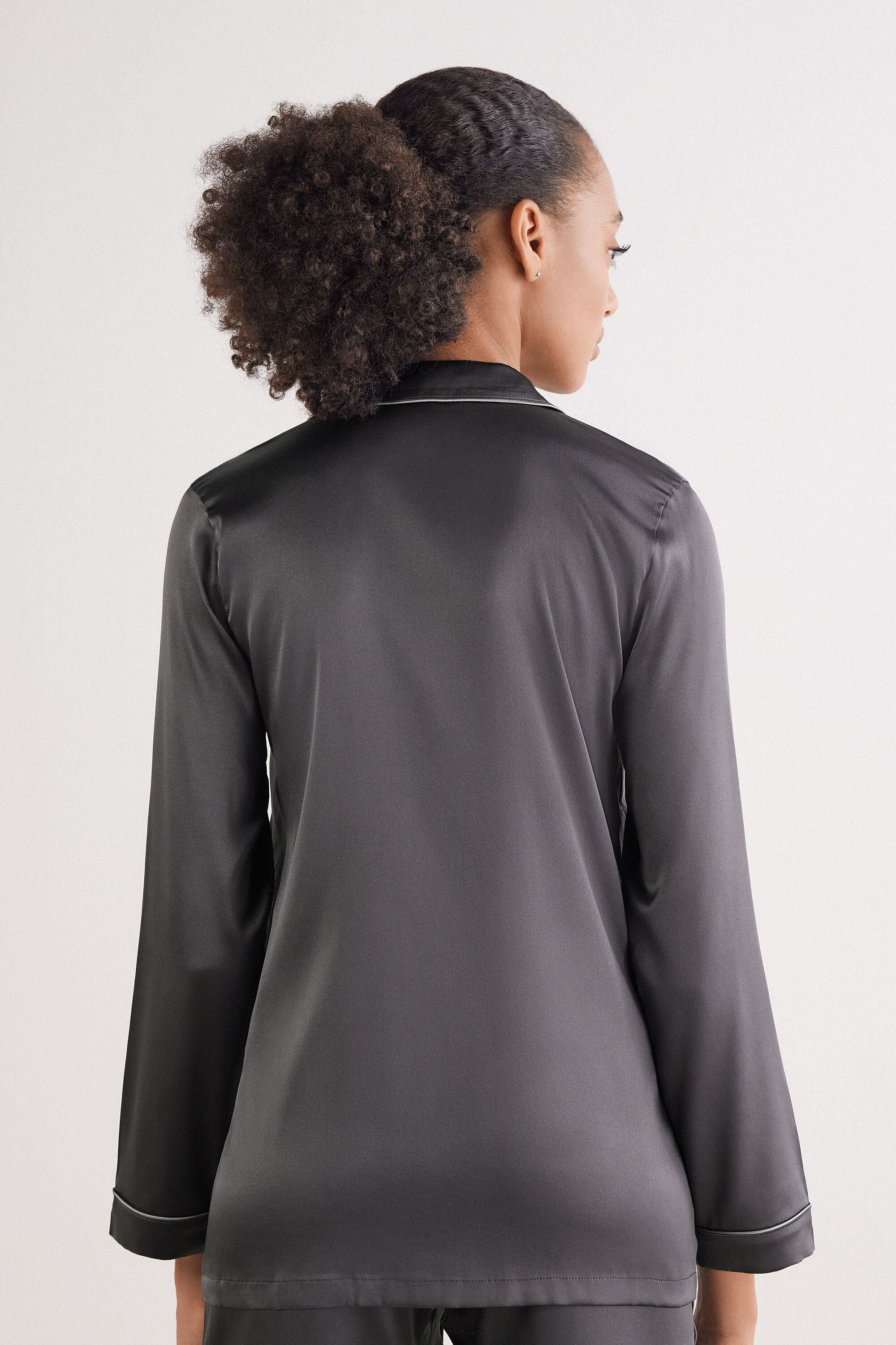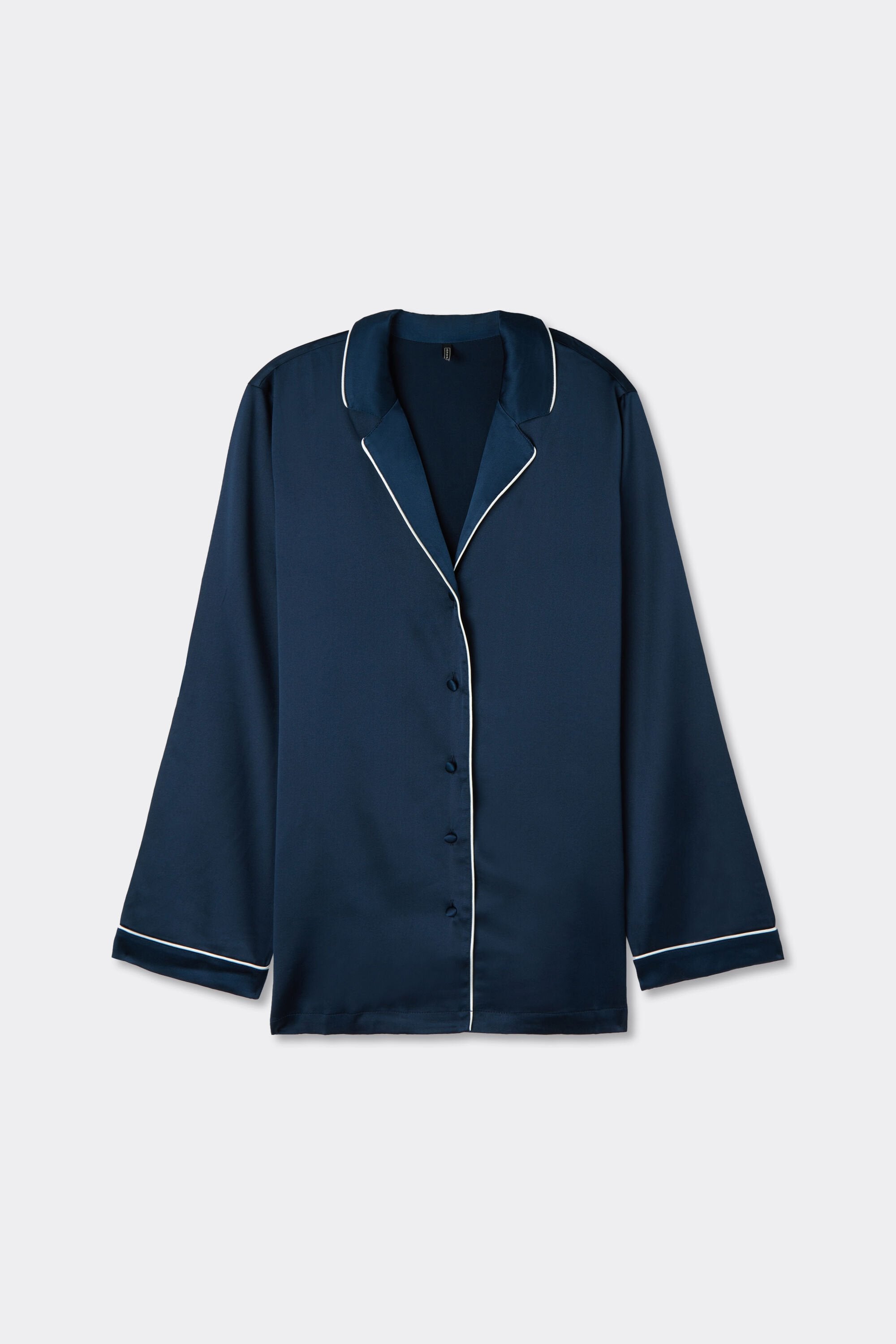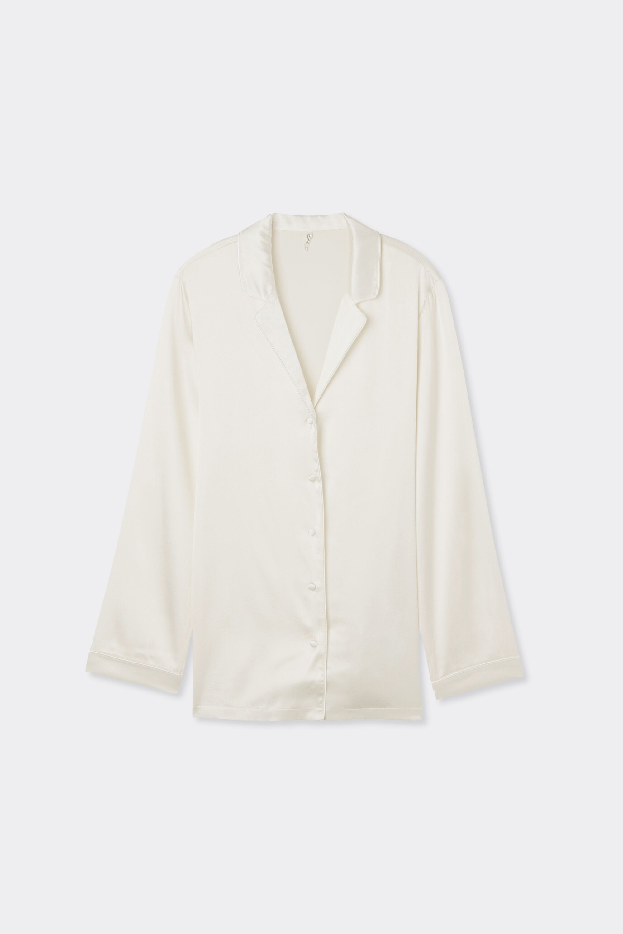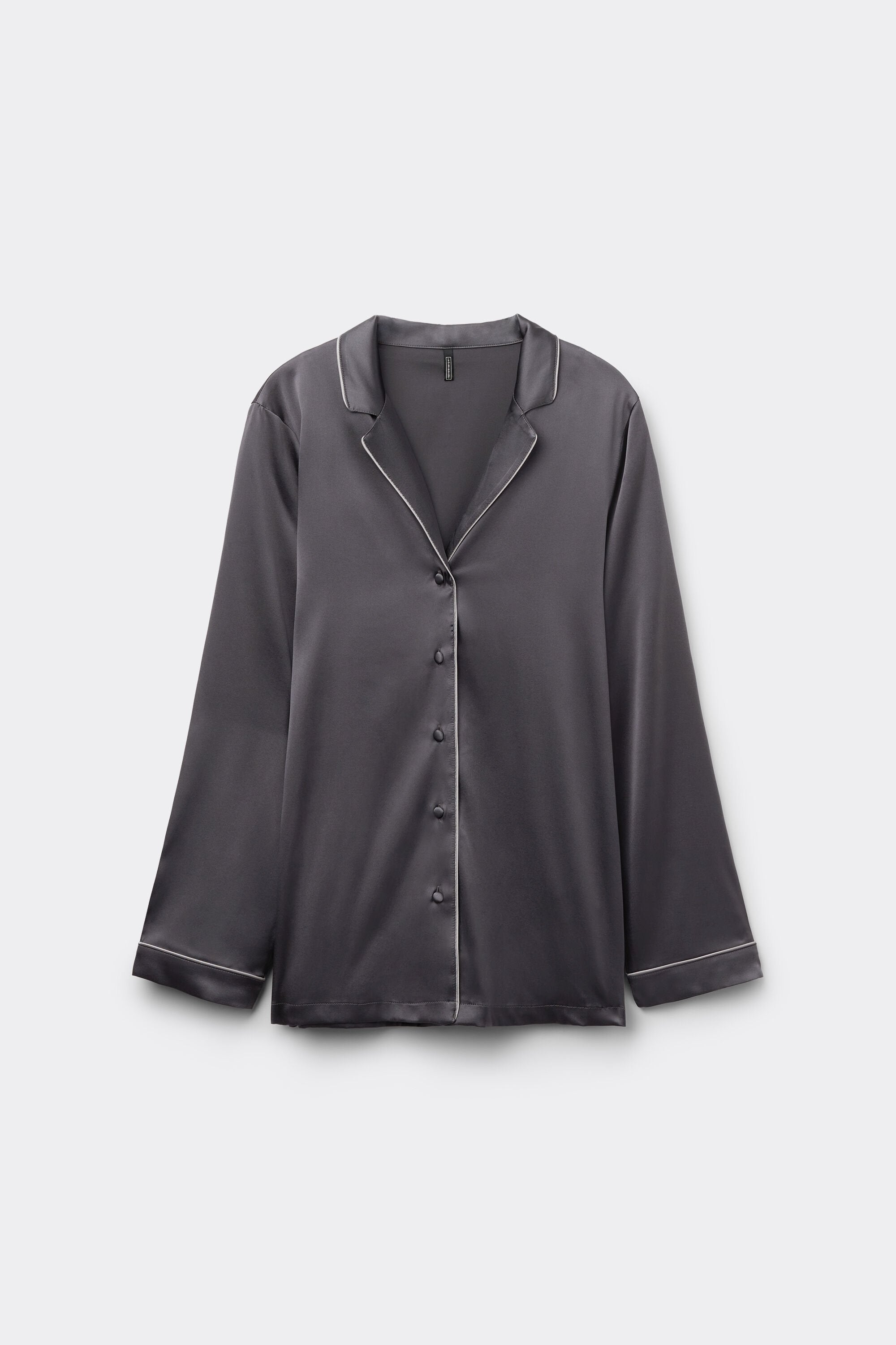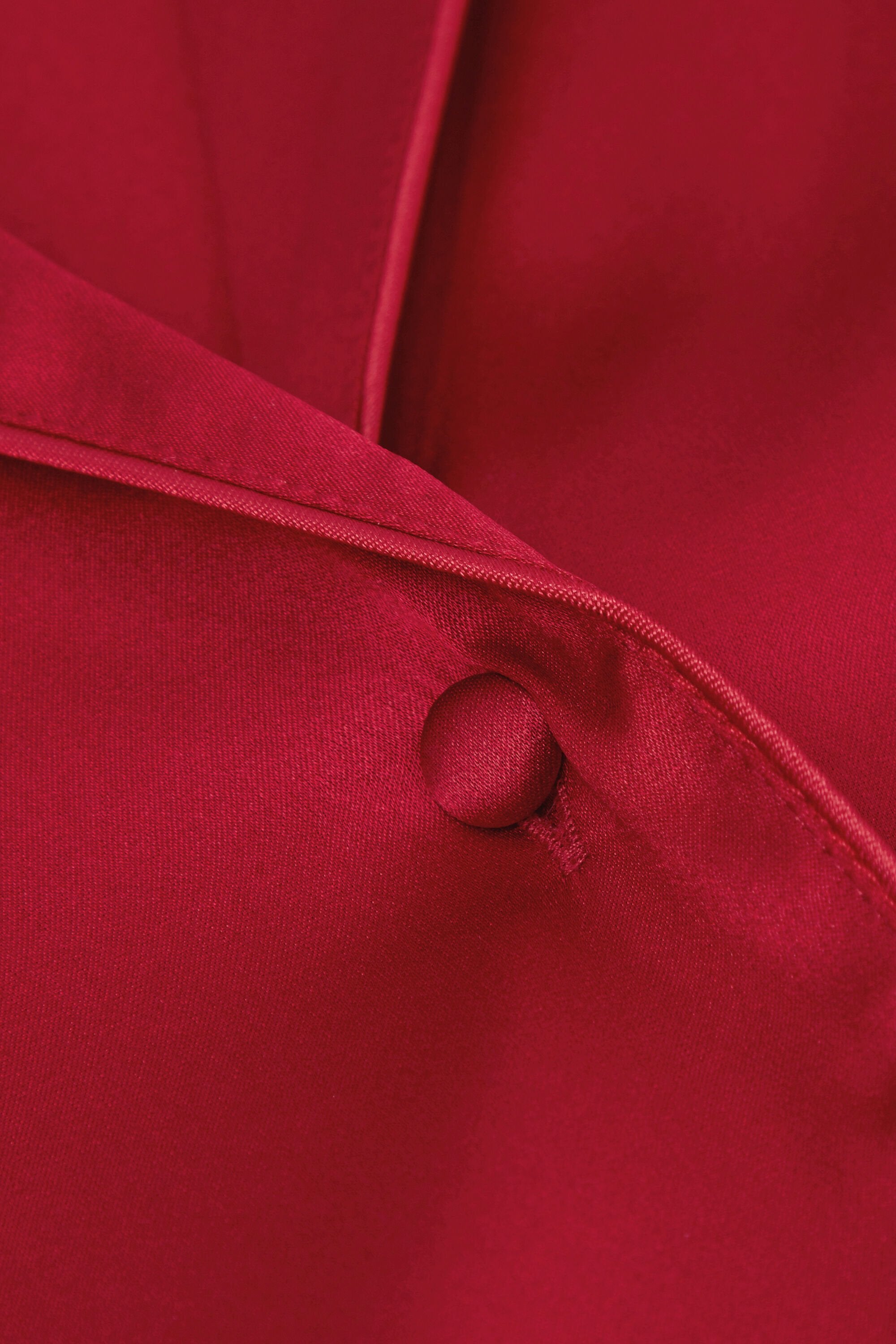The jacket features a classic menswear-inspired cut in a light stretch silk satin, finished with elegant trim details that create a subtle, tailored statement.