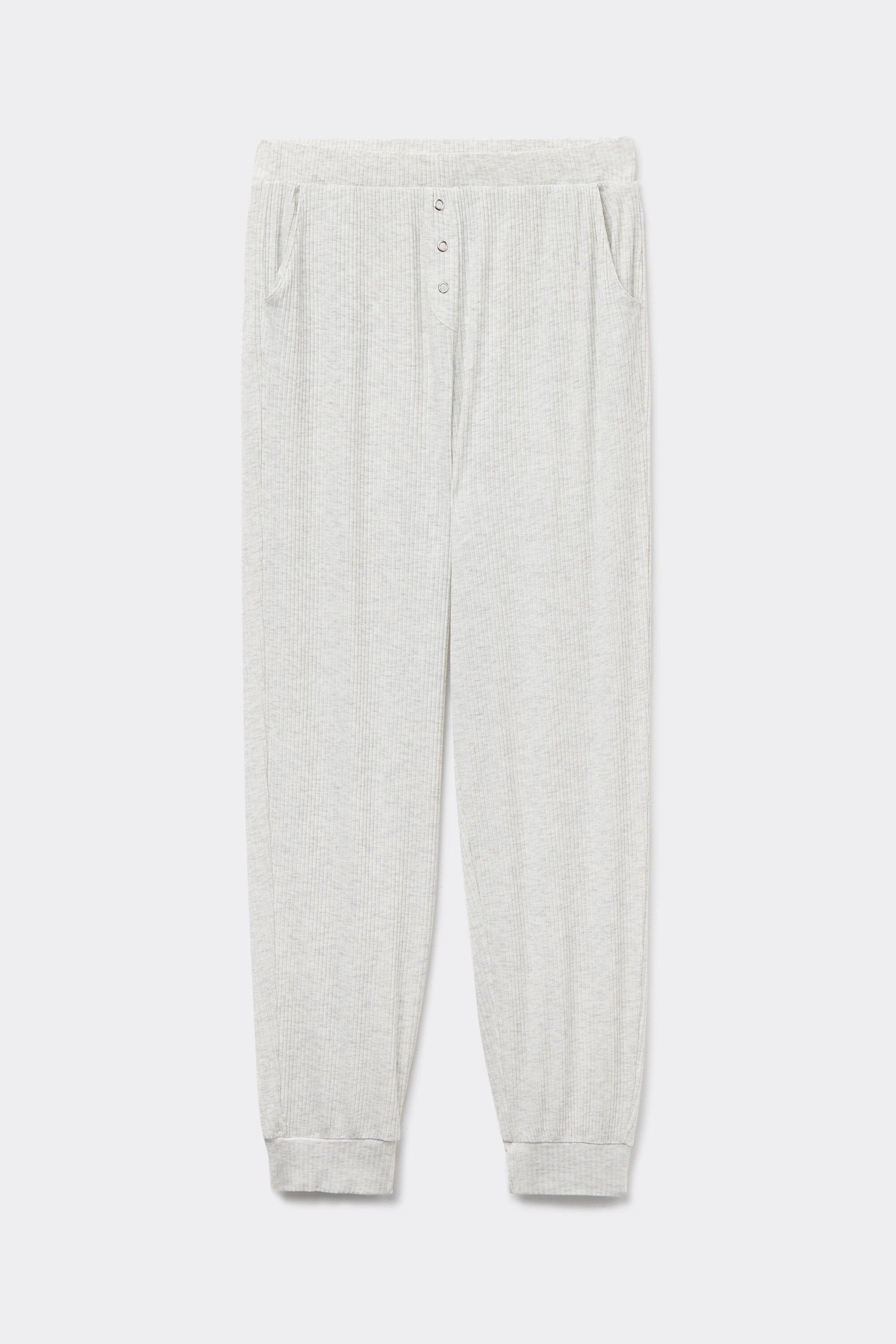Full-length pants crafted from soft ribbed modal fabric, featuring a unique detail with automatic buttons on the false fly for a relaxed, menswear-inspired effect.
