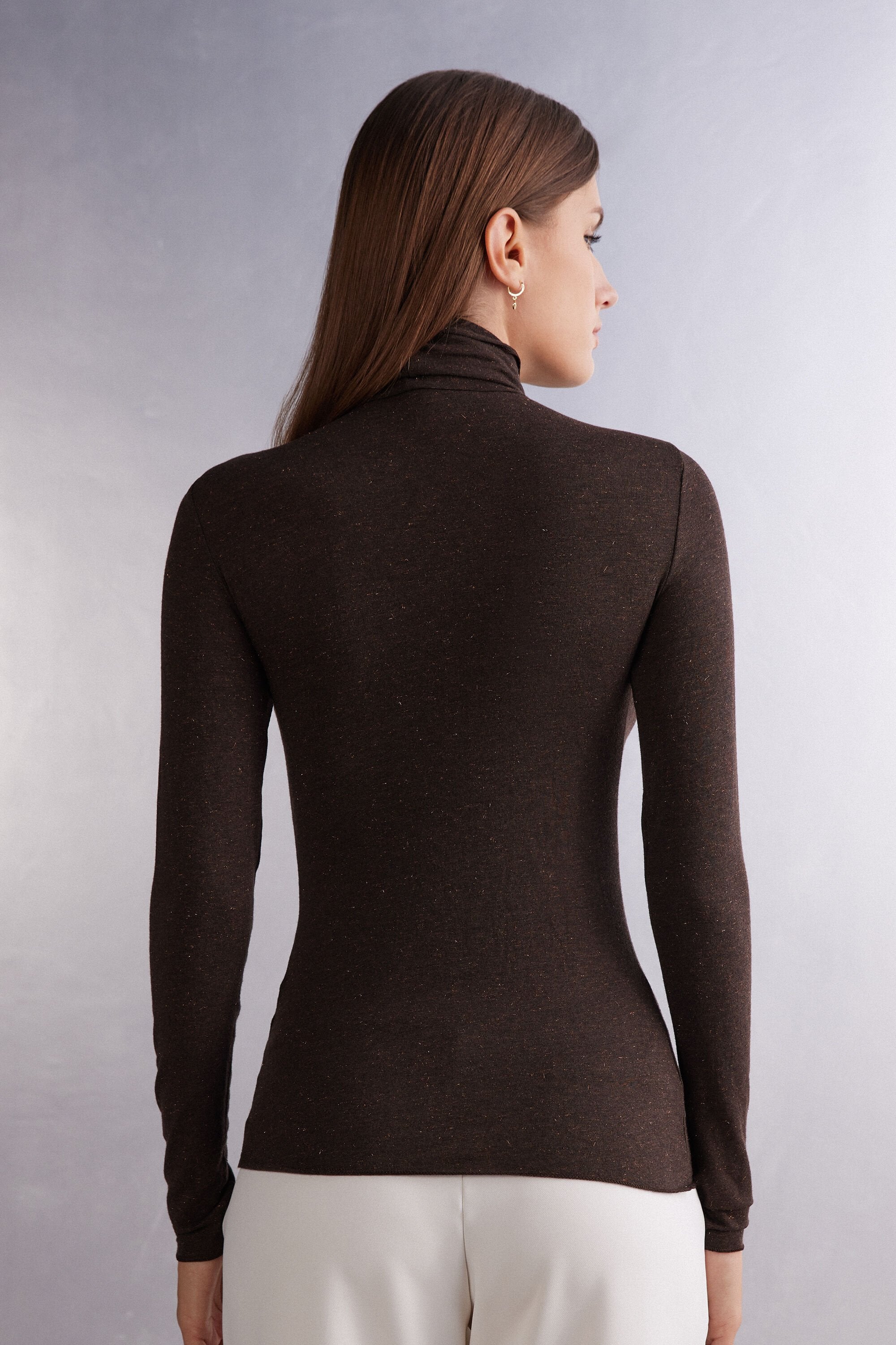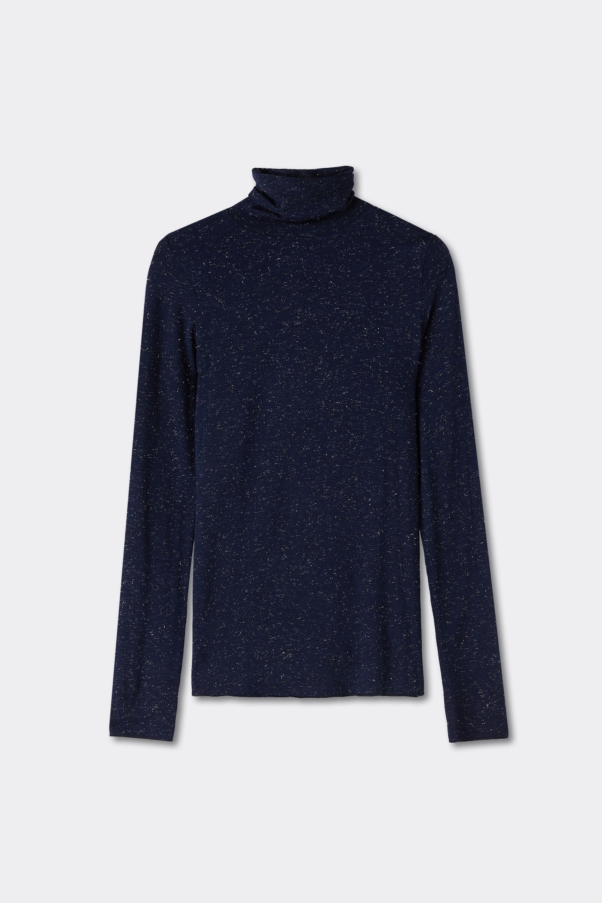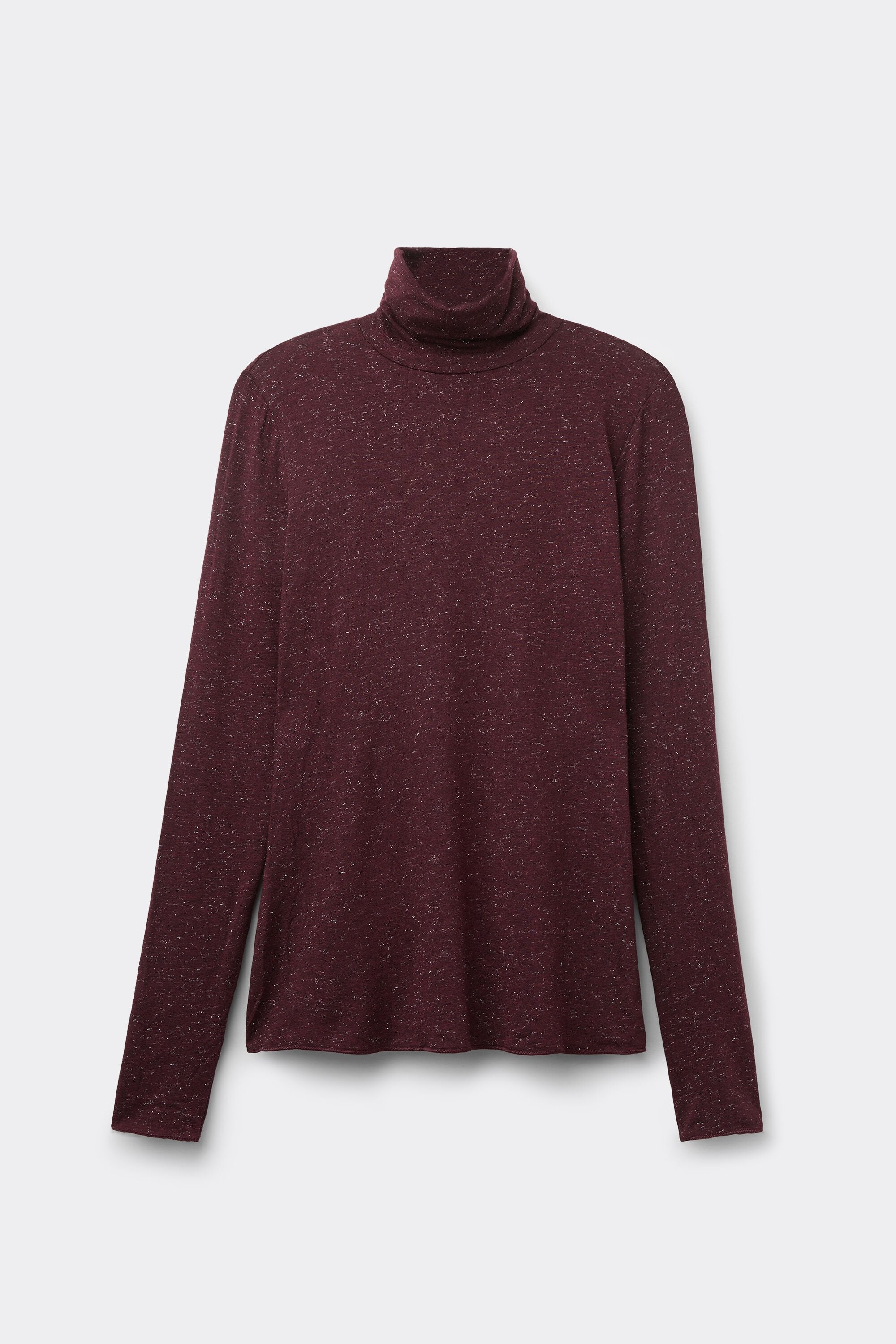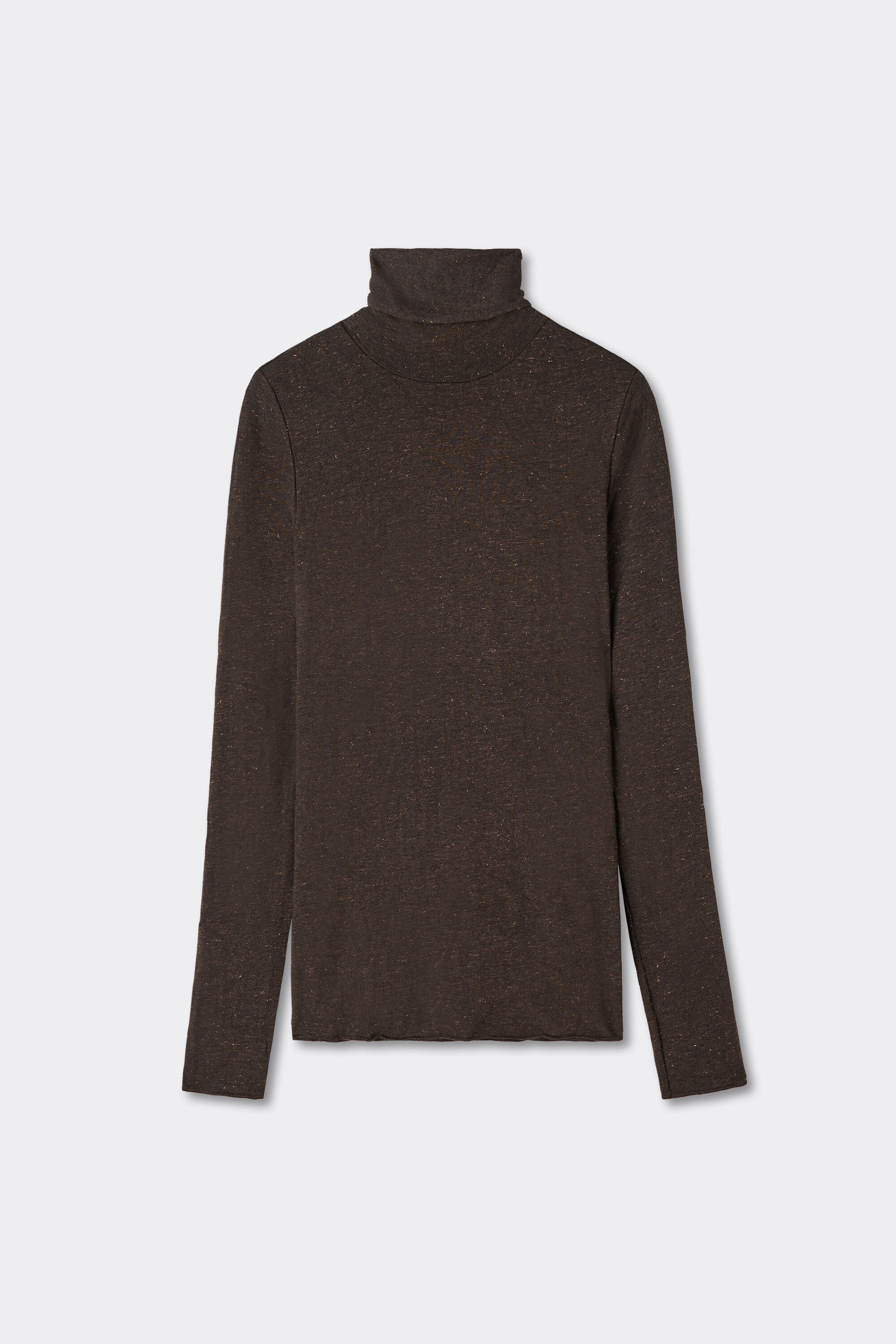 This long sleeve turtleneck blends natural softness with a delicate shimmer, crafted from a lightweight modal and cashmere mix for a soft feel with a subtle sheen. The sleek, non-restrictive shape and minimal seams make it an ideal base layer that moves with you.